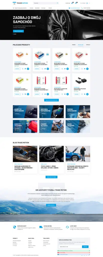 Dla sklepu internetowego TradeMotion.pl wykonaliśmy indywidualną szatę graficzną zgodnie z wytycznymi UI/UX, życzeniami klienta i możliwościami jakie daje nam Prestashop.